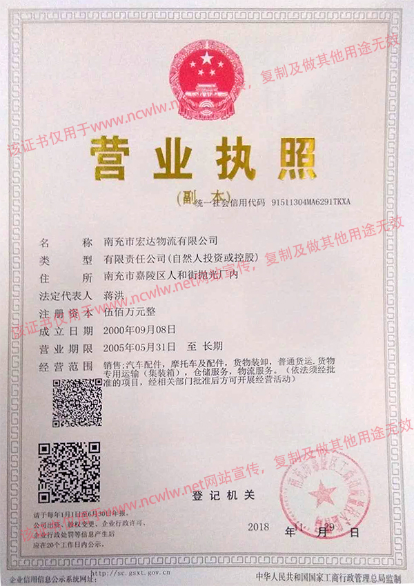 南充物流網(wǎng)(m.lclsv.com) 南充市宏達(dá)物流有限公司營(yíng)業(yè)執(zhí)照